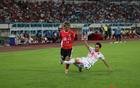 全场起立、齐唱国歌后,在被烘托至火热的氛围下,湛佛之战正式打响!上半场,身穿红色球衣的湛江队在3万多名主场热情球迷的加油助威下,大打攻势足球,如“红潮风暴”一样在绿茵场上向对手不断发起冲击。佛山队门前风声鹤唳,可惜湛江队未能把握住破门机会,上半场双方战成0:0。
