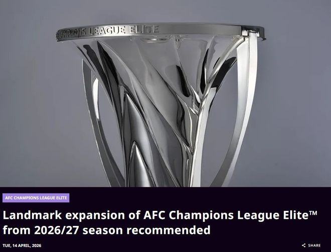 4月14日,亚足联官方发布消息,从下赛季开始,亚冠精英联赛拟从目前的24队扩军至32队,东亚区和西亚区各16队。